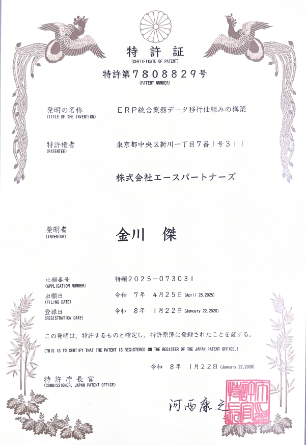 株式会社エースパートナーズ(本社:東京都中央区、代表取締役:金川 傑)は、ERPシステムにおける業務データ移行を統合的に管理する技術について、日本国特許庁より特許を取得しました。